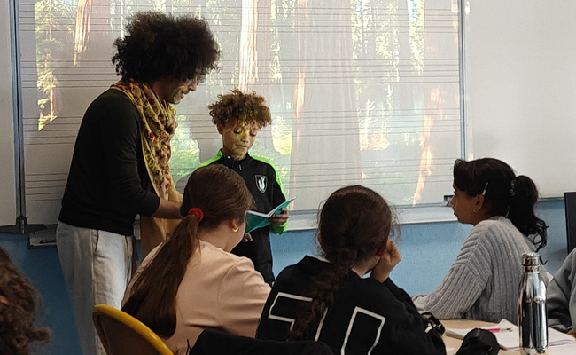 Avec les élèves du Collège Jean Moulin : ateliers d’écriture, découverte de la poésie, pratique vocale et apprentissage des partitions tout au long de l’année scolaire.