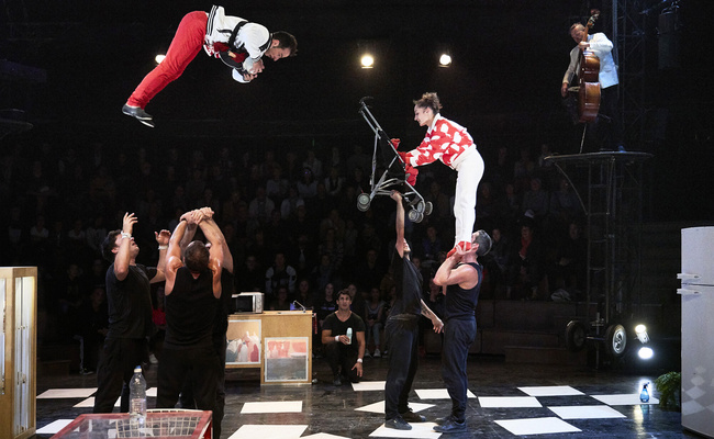 Pierre Guillois, maître ès-burlesque, fait la synthèse idéale du fou-rire et de la haute voltige : les frigos se balançent, les machines à laver passent de mains en mains avant de s'envoler, le quotidien s'affole dans un charivari acrobatique et joyeusement communicatif. Sous leur chapiteau rouge et blanc, les as de la piste entrelacent les gestes domestiques aux pirouettes les plus incroyables pour un inventaire loufoque de nos petits travers !